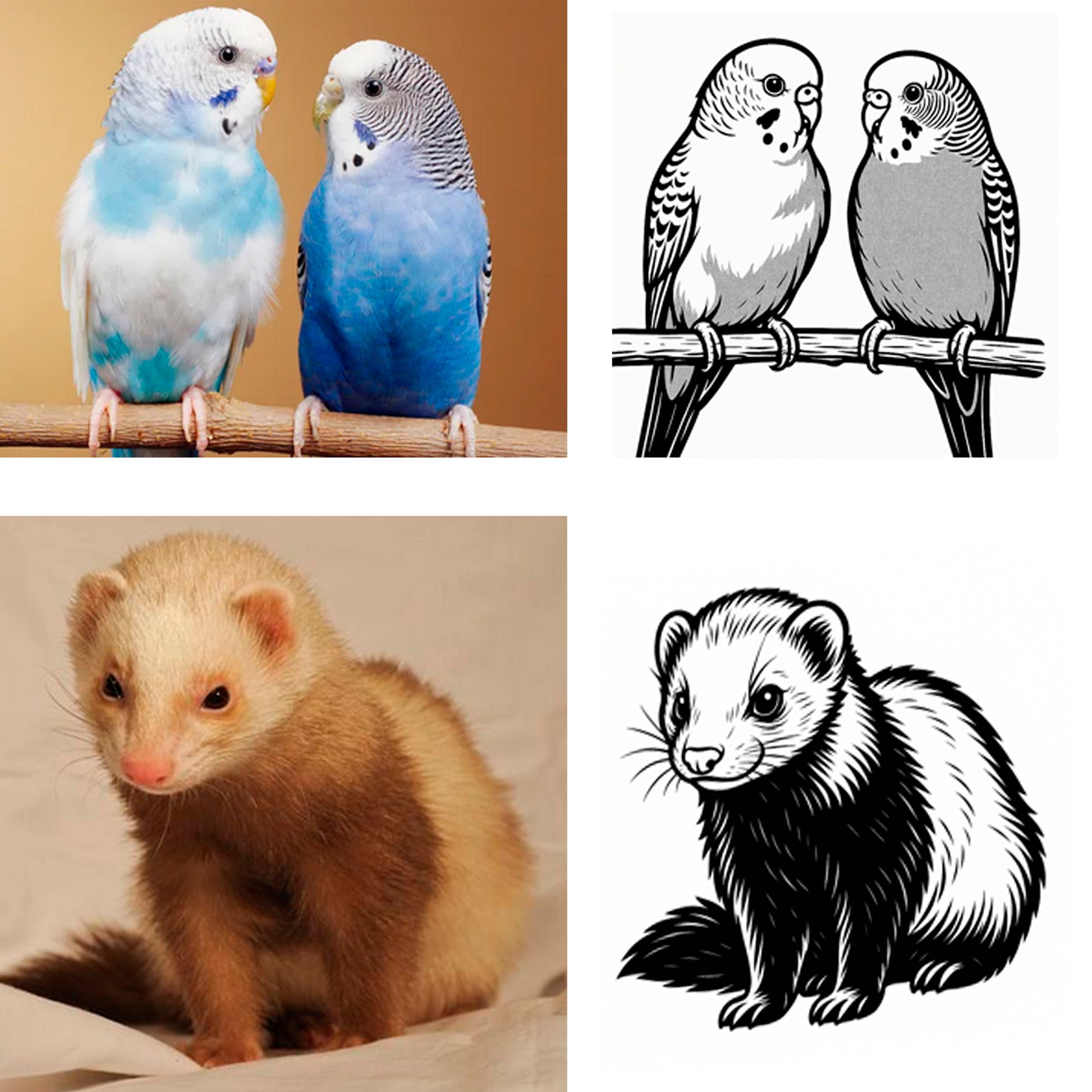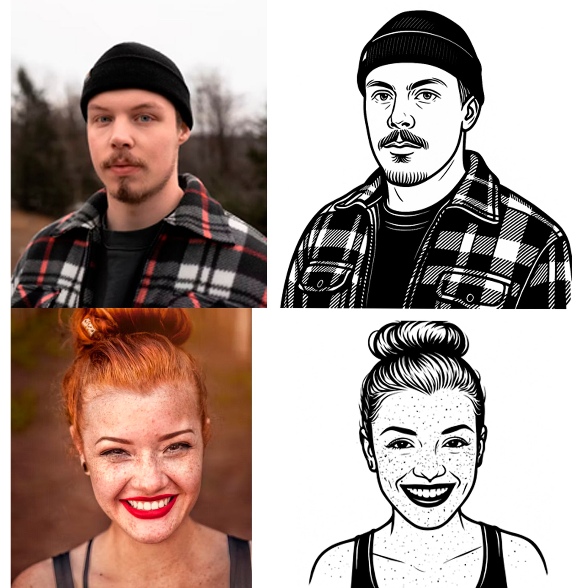 El proceso del pedido consiste en enviar una foto de buena calidad, el mínimo deberá ser 1050x1050 pixeles. Tenga en cuenta los tamaños de las placas. Luego haré una ilustación del dibujo en blanco y negro. Una vez hecha la ilustración se la envio al cliente para que confirme si es de su agrado. Después voy a proceder a el grabado de la placa personalizada. El grabado se realiza tipo mecanizado o rayado semi-profundo sobre metal dando un aspecto rugoso al tacto. El ultimo paso es dar un toque de tinta negra y un pulido semi- abrillantado. Las bases de metal son de Zamack (Zinc y Niquel) y tienen un estilo propio y único retro-vintage. Són resistentes y duraderos. El la cara posterior de la placa grabo texto o dedicatoria. Fuente de letra INK . La ilustración en formatos PNG y SGV puedes hacer uso de ella para grabar o imprimir camisetas, Cricut Explore, Silhouette Designer, cuadros o lo que quieras. Solo para uso personal NO comercial.